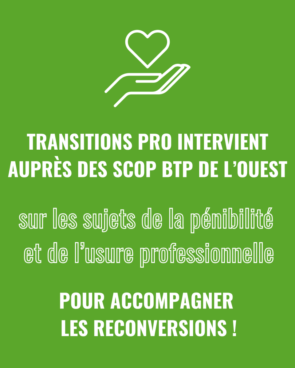 Transitions pro Pays de la Loire, Bretagne et Normandie, est intervenu auprès des Scop BTP de l'Ouest La Scetec, CCE, Batiroise, Penn Ar Bât et STEPP autour des sujets de la pénibilité et de l'usure professionnelle, pour accompagner les reconversions !